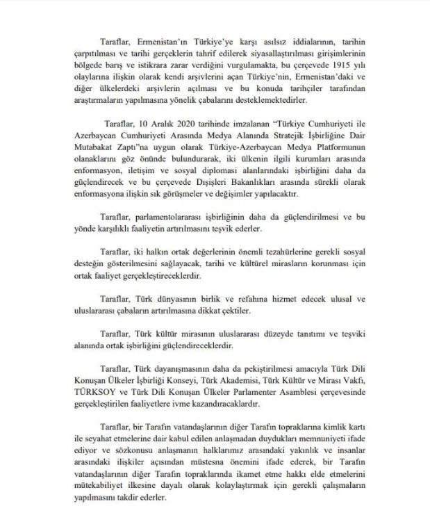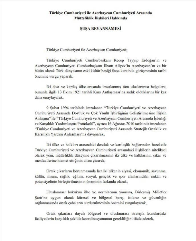 Şuşa Beyannamesi'nde Ermenistan'ın Türkiye'ye karşı asılsız iddialarının, tarihin çarpıtılması girişimlerinin bölgede barış ve istikrara zarar verdiği vurgulandı.