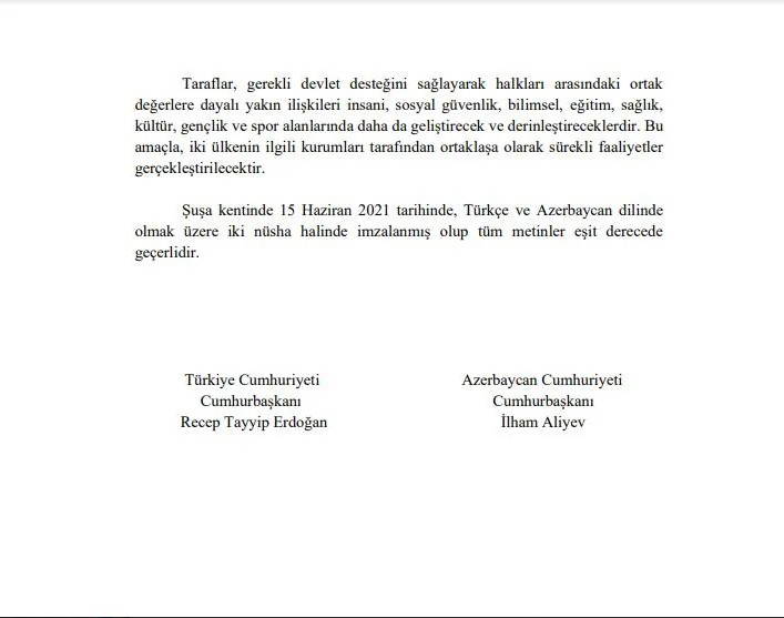 Aliyev, Türkiye ile Azerbaycan arasında imzalanan "Müttefiklik Sözleşmesi"nde 100 yıl önce imzalanan Kars Anlaşmasına atıfta bulunulduğunu da bildirdi.