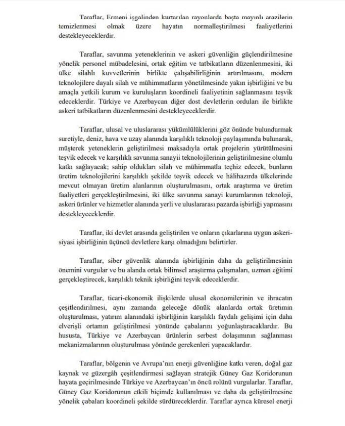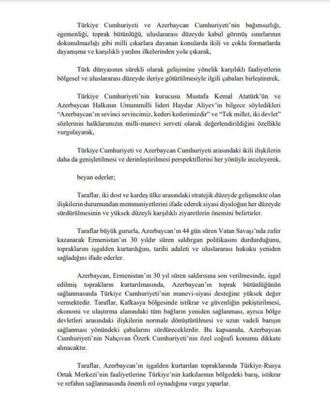 - Türkiye olarak kardeşlerimize yeniden inşa sürecinde de her türlü katkıyı veriyoruz vermeye devam edeceğiz. Bir yandan yıkımları telafi ederken diğer yandan Azerbaycan topraklarını benzer felaketi yaşamaması için tedbirleri alacağız. Ermenistan'ı kendisine uzatılan bu iyi niyet elini tutmasını, fırsatı iyi kullanmasını temenni ediyoruz. Ermenistan ile normalleşme için biz de üzerimize düşeni yapacağımızı her fırsatta söylüyoruz. Bugün tek millet iki devlet temelinde yükselttiğimiz ilişkileri daha ileri taşıyacak tarihi adımı attık.