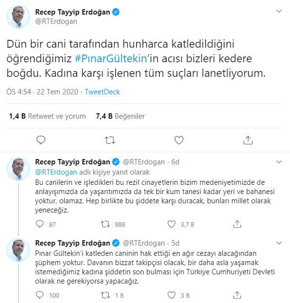 "Dün bir cani tarafından hunharca katledildiğini öğrendiğimiz #PınarGültekin’in acısı bizleri kedere boğdu. Kadına karşı işlenen tüm suçları lanetliyorum. Bu canilerin ve işledikleri bu rezil cinayetlerin bizim medeniyetimizde de anlayışımızda da yaşantımızda da tek bir kum tanesi kadar yeri ve bahanesi yoktur, olamaz. Hep birlikte bu şiddete karşı duracak, bunları millet olarak yeneceğiz.