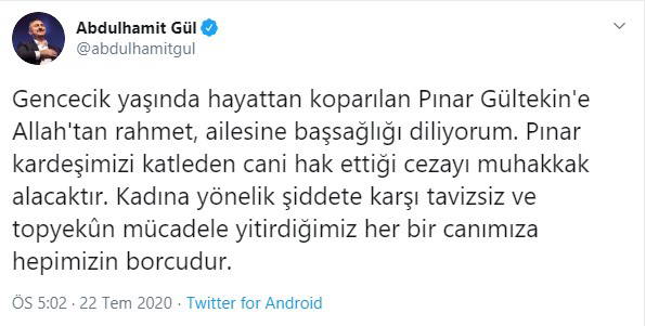 "Gencecik yaşında hayattan koparılan Pınar Gültekin'e Allah'tan rahmet, ailesine başsağlığı diliyorum. Pınar kardeşimizi katleden cani hak ettiği cezayı muhakkak alacaktır. Kadına yönelik şiddete karşı tavizsiz ve topyekûn mücadele yitirdiğimiz her bir canımıza hepimizin borcudur."