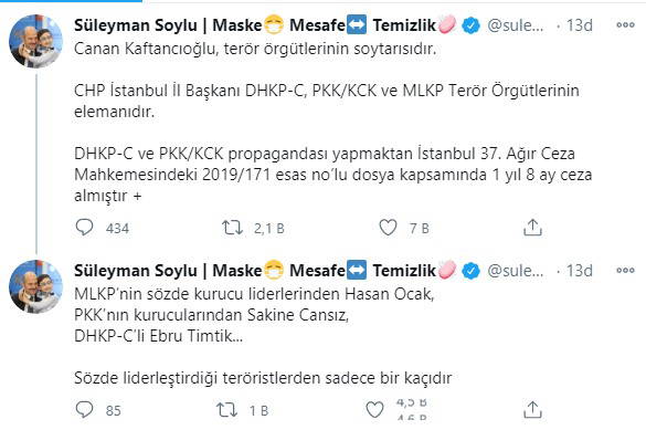 Boğaziçi Üniversitesi'nde, öğrenciler tarafından düzenlenen rektör protestosuna desteğe giden CHP İstanbul İl Başkanı Canan Kaftancıoğlu hakkında iktidar cephesinden açıklamalar gelmeye devam ediyor. AKP Genel Başkanı ve Cumhurbaşkanı Recep Tayyip Erdoğan'ın "Kendisi DHKP-C militanıdır" diyerek hedef almasının ardından bu kez de İçişleri Bakanı Süleyman Soylu, Kaftancıoğlu'na ağır hakaretlerde bulundu.