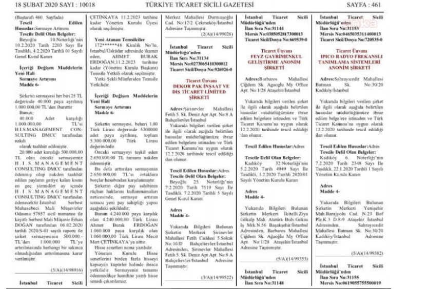 Cumhurbaşkanı Erdoğan’ın oğlu Ahmet Burak Erdoğan’ın ortağı olduğu MB Denizcilik 2 milyon 650 bin liralık sermaye artırımına giderek, sermayesini 5 milyon 300 bin liraya çıkardı.