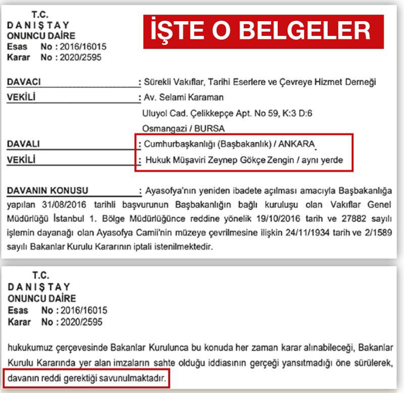 Sözcü'den Saygı Öztürk'ün haberine göre, Cumhurbaşkanlığı'nı temsilen duruşmaya katılan Hukuk Müşaviri Zeynep Gökçe Zengin'in Ayasofya'nın müze olarak kalması yönünde görüş bildirdiği belirlendi. Ayasofya'nın yeniden ibadete açılması amacıyla Başbakanlığa 2016'da başvurulmuştu. Vakıflar Genel Müdürlüğü İstanbul 1. Bölge Müdürlüğü bu isteği reddetti. Derneğin savunması şöyle oldu: “Dava konusu Bakanlar Kurulu Kararındaki imzaların gerçekliği incelenmeli. Tapuda ‘müze' değil, ‘cami' ifadesi yer alıyor. Vakıf malı olan Ayasofya'nın cami olarak kullanılması gerektiğinden Bakanlar Kurulu kararı iptal edilmeli.”