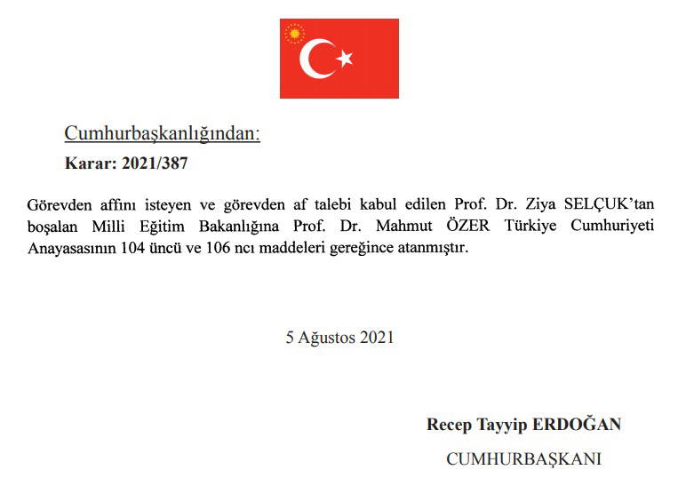 Yayımlanan kararda, "Görevden affını isteyen ve görevden af talebi kabul edilen Prof. Dr. Ziya Selçuk'tan boşalan Milli Eğitim Bakanlığı'na Prof. Dr. Mahmut Özer Türkiye Cumhuriyeti Anayasası'nın 104 üncü ve 106 ncı maddeleri gereğince atanmıştır" ifadelerine yer verildi.