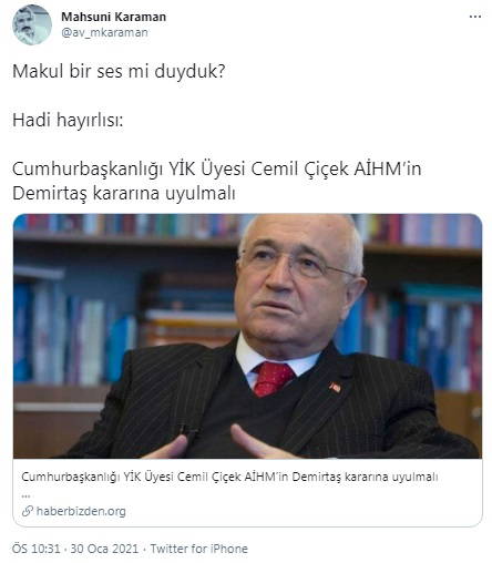 Selahattin Demirtaş'ın avukatı Mahsuni Karaman da Cemil Çiçek'in AİHM mesajıyla ilgili olarak Twitter hesabından bir paylaşımda bulundu. Karaman, Çiçek'in ilgili sözlerinin yer aldığı haberi paylaşıp "Makul bir ses mi duyduk? Hadi hayırlısı" diye yazdı.