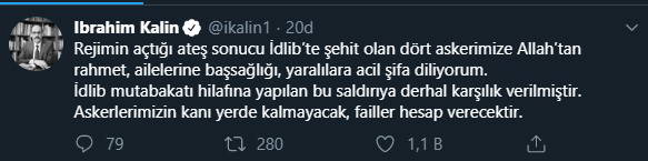 Cumhurbaşkanlığı sözcüsü İbrahim Kalın kişisel twitter hesabından 'Rejimin açtığı ateş sonucu İdlib'te şehit olan dört askerimize Allah'tan rahmet, ailelerine başsağlığı, yaralılara acil şifa diliyorum. İdlib mutabakatı hilafına yapılan bu saldırıya derhal karşılık verilmiştir. Askerlerimizin kanı yerde kalmayacak, failler hesap verecektir' açıklamasında bulundu.