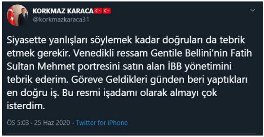Karaca paylaşımında, “Siyasette yanlışları söylemek kadar doğruları da tebrik etmek gerekir. Venedikli ressam Gentile Bellini’nin Fatih Sultan Mehmet portresini satın alan İBB yönetimini tebrik ederim. Göreve Geldikleri günden beri yaptıkları en doğru iş. Bu resmi işadamı olarak almayı çok isterdim” ifadelerini kullandı.