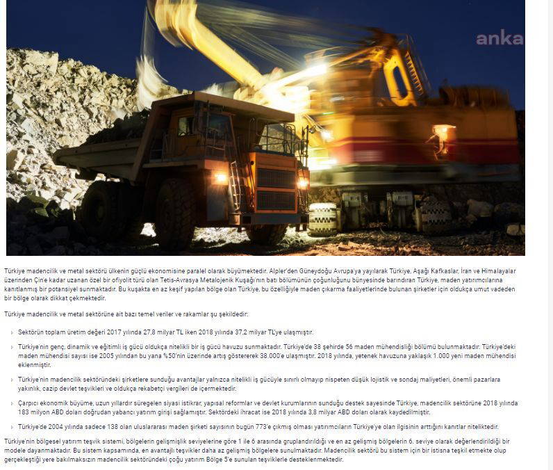 “Türkiye madencilik ve metal sektörü ülkenin güçlü ekonomisine paralel olarak büyümektedir. Alpler’den Güneydoğu Avrupa'ya yayılarak Türkiye, Aşağı Kafkaslar, İran ve Himalayalar üzerinden Çin'e kadar uzanan özel bir ofiyolit türü olan Tetis-Avrasya Metalojenik Kuşağı'nın batı bölümünün çoğunluğunu bünyesinde barındıran Türkiye, maden yatırımcılarına kanıtlanmış bir potansiyel sunmaktadır. Bu kuşakta en az keşif yapılan bölge olan Türkiye, bu özelliğiyle maden çıkarma faaliyetlerinde bulunan şirketler için oldukça umut vadeden bir bölge olarak dikkat çekmektedir.