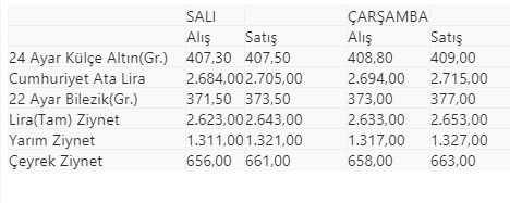 İstanbul Kapalıçarşı'da alınıp satılan altın türlerinin, önceki kapanış ve bugün açılış fiyatları (TL) şöyle: