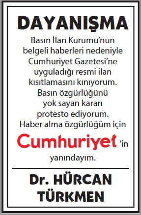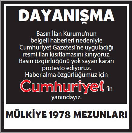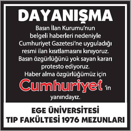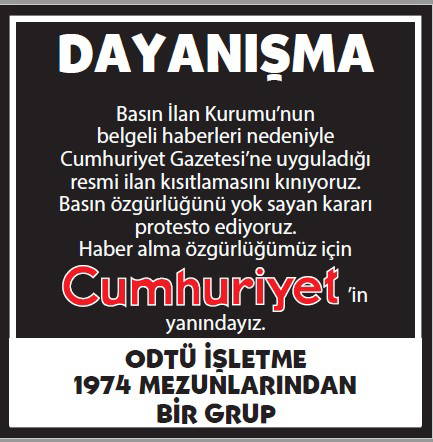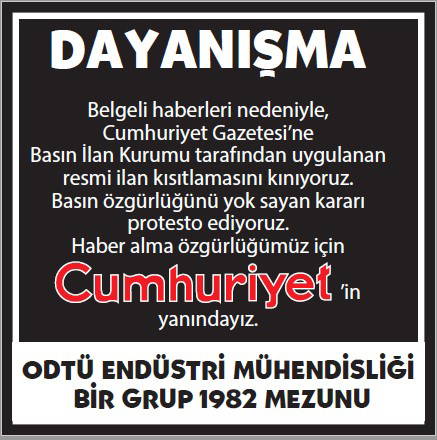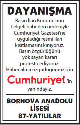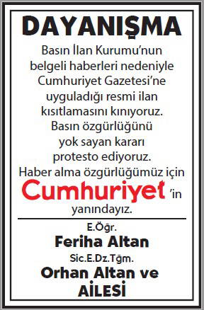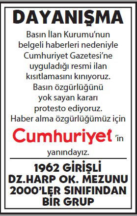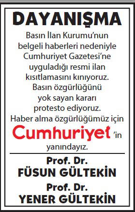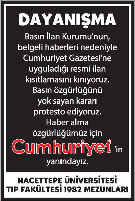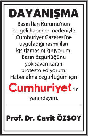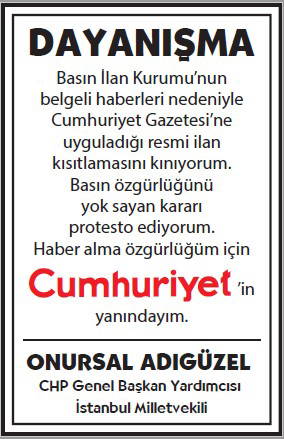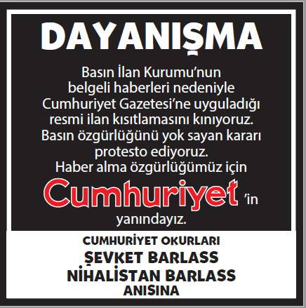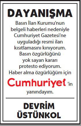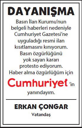 Basın İlan Kurumu'nun gazetemize yönelik ilan cezalarına karşı okurlarımızın 'dayanışması' büyüyerek sürüyor. Cumhuriyet'e 'dayanışma ilanları'yla büyük güç veren gazetemizin gerçek sahibi okurlarımızın sayfalarımızda yayımlanan ilanlarına dijital dünyadaki sesimiz www.cumhuriyet.com.tr'de de yer vereceğiz.