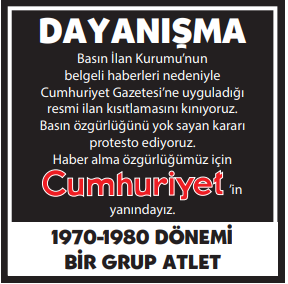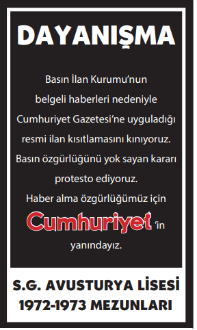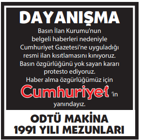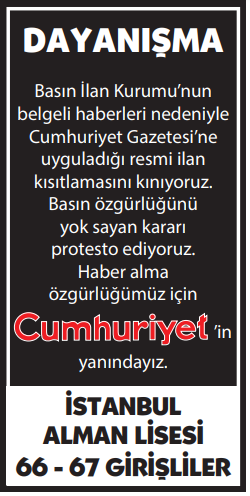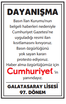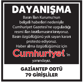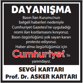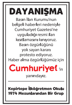 Basın İlan Kurumu'nun gazetemize yönelik ilan cezalarına karşı okurlarımızın 'dayanışması' büyüyerek sürüyor. Cumhuriyet'e 'dayanışma ilanları'yla büyük güç veren gazetemizin gerçek sahibi okurlarımızın sayfalarımızda yayımlanan ilanlarına dijital dünyadaki sesimiz www.cumhuriyet.com.tr'de de yer vereceğiz.