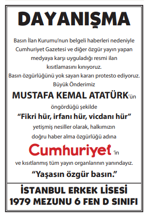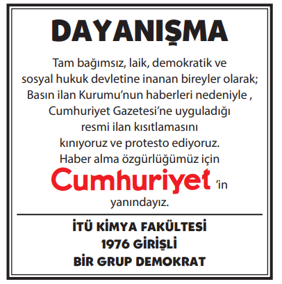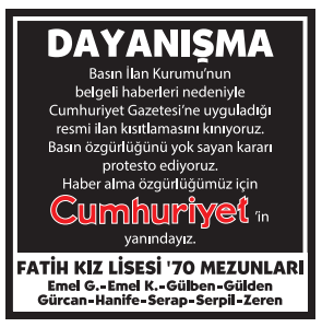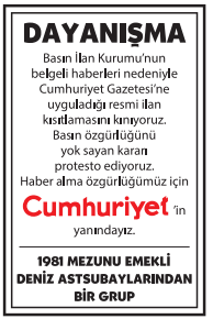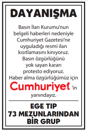 BASKI SÜRÜYOR, DAYANIŞMA BÜYÜYOR, OKURLARI CUMHURİYET'İ YALNIZ BIRAKMIYOR! BASIN İLAN KURUMU'NUN CUMHURİYET'E YÖNELİK İLAN KESME CEZALARINA KARŞI OKURLARIMIZ DAYANIŞMA İLANLARI VERİYOR, BAĞIMSIZ VE GÜÇLÜ CUMHURİYET'E DESTEK OLUYOR. DAYANIŞMA İLANLARI HAKKINDA BİLGİ İÇİN AŞAĞIDAKİ İLETİŞİM BİLGİLERİNİ KULLANABİLİRSİNİZ.