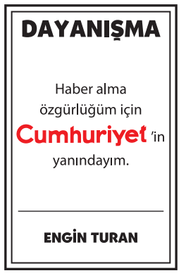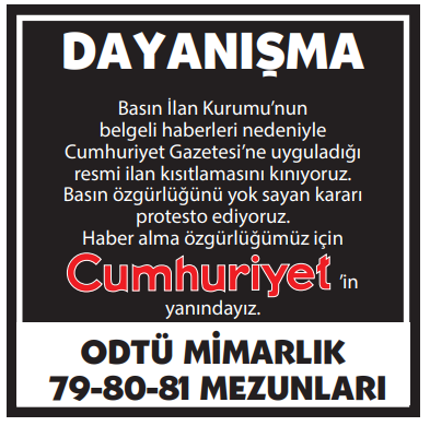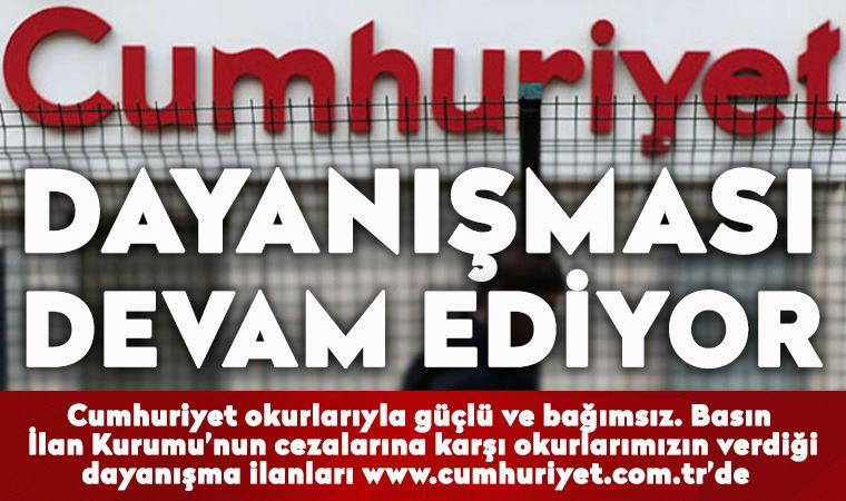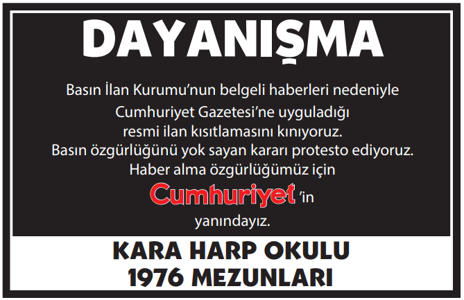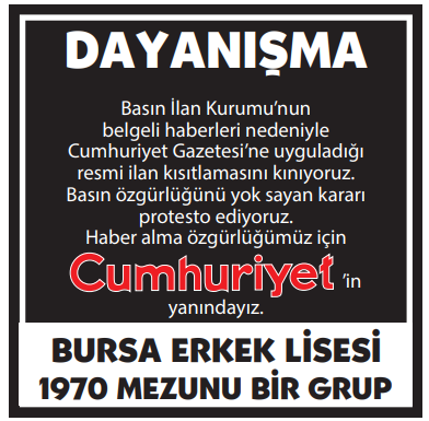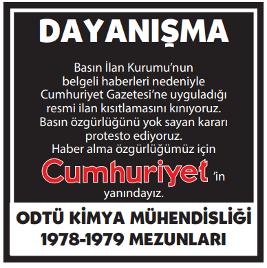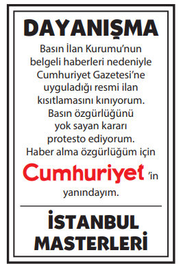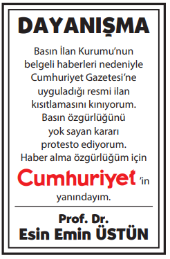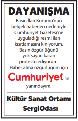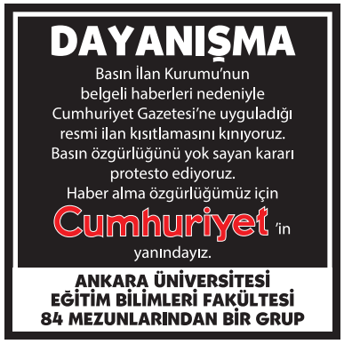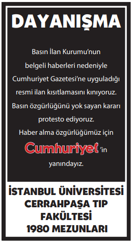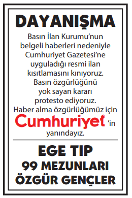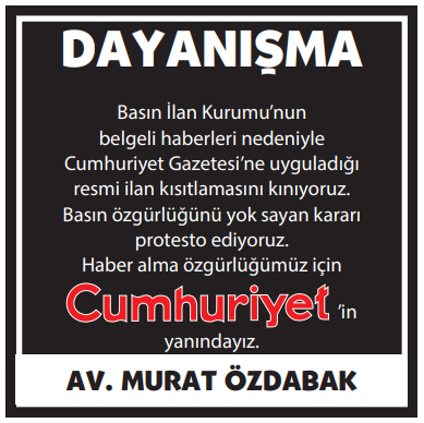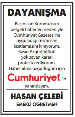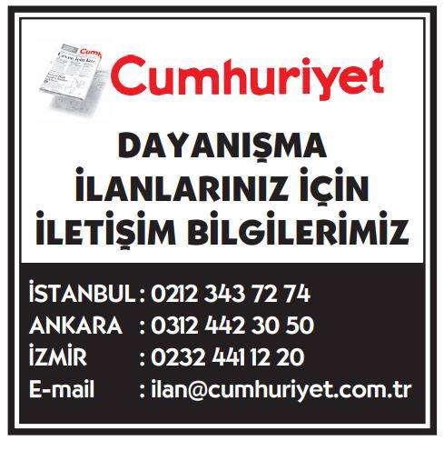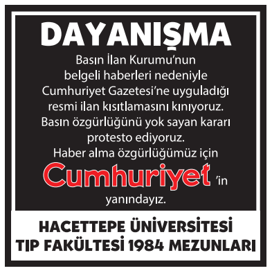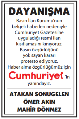 BASKI SÜRÜYOR, DAYANIŞMA BÜYÜYOR, OKURLARI CUMHURİYET'İ YALNIZ BIRAKMIYOR! BASIN İLAN KURUMU'NUN CUMHURİYET'E YÖNELİK İLAN KESME CEZALARINA KARŞI OKURLARIMIZ DAYANIŞMA İLANLARI VERİYOR, BAĞIMSIZ VE GÜÇLÜ CUMHURİYET'E DESTEK OLUYOR. DAYANIŞMA İLANLARI HAKKINDA BİLGİ İÇİN AŞAĞIDAKİ İLETİŞİM BİLGİLERİNİ KULLANABİLİRSİNİZ.