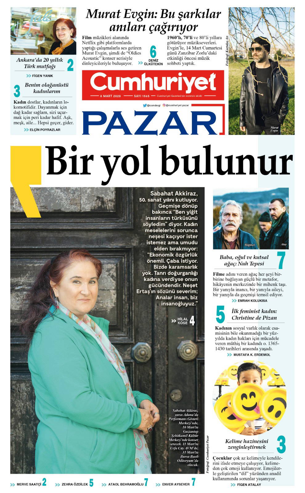 Bu hafta, 50. sanat yılını kutlayana Sabahat Akkiraz’la buluştuk. Müziğe, türkülere, ülkeye ve kadın meselelerine dair konuştuk. Akkiraz, “Kadınlar kendi değerlerini bilsinler, bilirlerse direnirler, güçlüler çünkü” diyor. Akkiraz, 50. yılını 2020 adet çıkardığı özel bir plakla kutluyor. “Sabahat Akkiraz ile 50 yıl 1970/2002” albümünde 12 eser var. Ses Verin Sesime Dağlar, Değme Felek, Dağlar Kardeşimi Geri Ver gibi dillerden düşmeyen ağıtlarıyla ve türküleriyle selamlıyor dinleyicilerini. Bir de sürprizi var: Erci E ile Halkalı Şeker türküsüyle harmanlanmış rap şarkısı Bana Gel Beni Gör'ü seslendiriyor. Albüm kitapçığı ise tam anlamıyla bir albüm. Akkiraz’ın ilk gençlik yıllarından fotoğrafları, Netfon Plak ile yaptığı ilk sözleşme, yabancı basında hakkında çıkan makaleler, pek çok anıyı sunuyor. Kitapçıkta, bir de CHP lideri Kemal Kılıçdaroğlu’nun, Akkiraz’ın gazeteci dostu Miyase İlknur’un ve Bakırköy Belediye Başkanı Bülent Kerimoğlu’nun yazısı var.