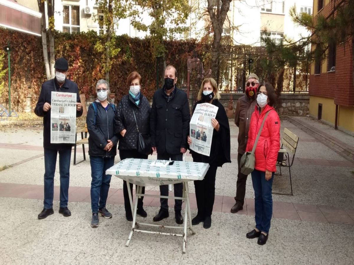 “Amaçları Cumhuriyet gazetesini ekonomik ve siyasal baskıyla yok etmek. Bizler, Cumhuriyet gazetesinin sadece okuru değil, sahibiyiz. Cumhuriyet patron gazetesi, holding gazetesi değildir. Cumhuriyet asla yalnız değildir. Cumhuriyet susmayacaktır.” ![]()