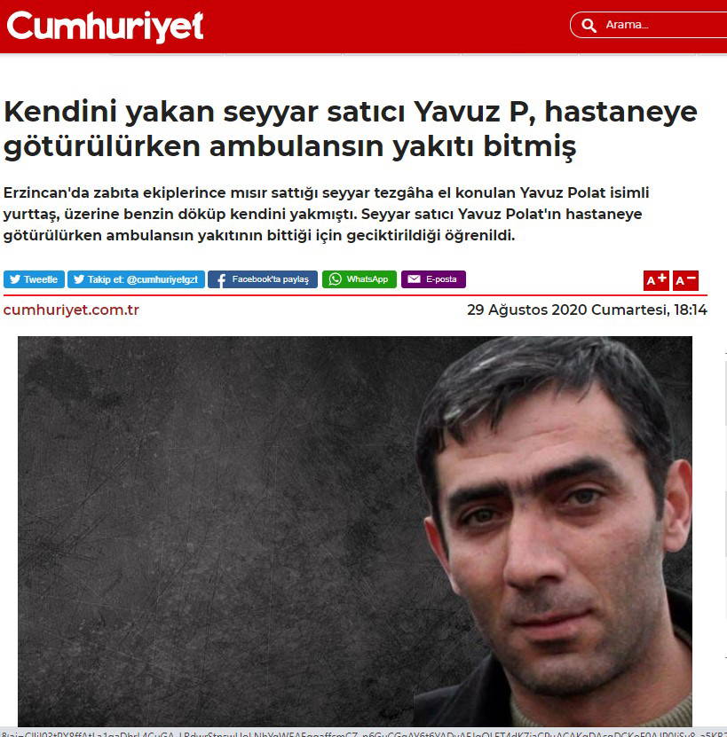 Cumhuriyet, ambulans skandalını "Kendini yakan seyyar satıcı Yavuz Polat hastaneye götürülürken ambulansın yakıtı bitmiş" başlığıyla haberleştirmişti.