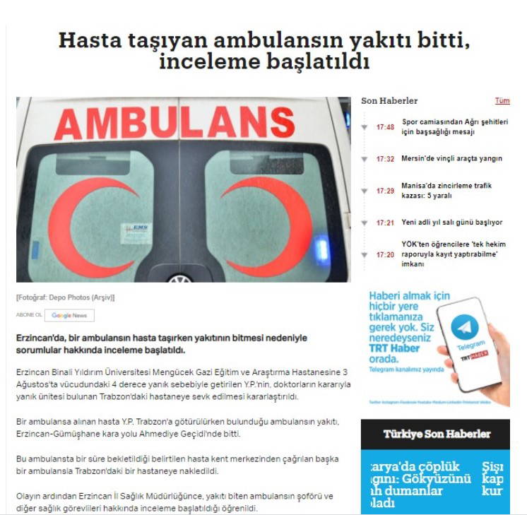 Konuyla ilgili haberde, "Bir ambulansa alınan hasta Y.P. Trabzon'a götürülürken bulunduğu ambulansın yakıtı, Erzincan-Gümüşhane Karayolu Ahmediye Geçidi'nde bitti. Bu ambulansta bir süre bekletildiği belirtilen hasta kent merkezinden çağrılan başka bir ambulansla Trabzon'daki bir hastaneye nakledildi" ifadeleri yer almıştı.