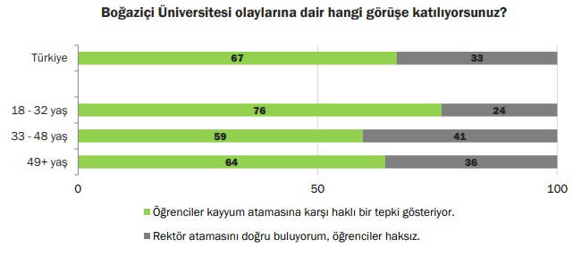 Araştırmada "Boğaziçi Üniversitesi olaylarına dair hangi görüşe katılıyorsunuz?” sorusuna yüzde 67'lik kesim “Öğrenciler kayyım atamasına karşı haklı bir tepki gösteriyor” diye yanıt verdi.