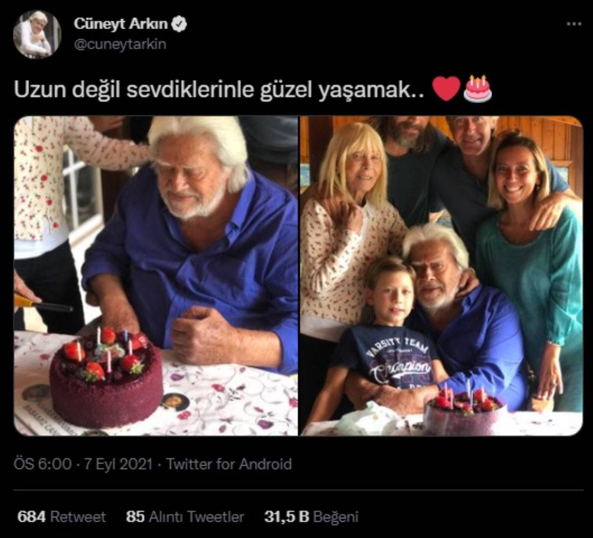 'Kara Murat' filmleri başta olmak üzere çok izlenen birçok projede yer alan Cüneyt Arkın, sosyal medya hesabından eşi Betül Cüreklibatır, oğulları Murat Arkın, Kaan Cüreklibatır ile gelini ve torununun olduğu fotoğrafları paylaşarak, doğum gününü kutladı.