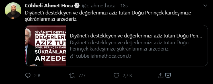 Perinçek'in bu açıklamalarının ardından, Cübbeli Ahmet Hoca olarak bilinen Ahmet Mahmut Ünlü, sosyal medya hesabından Perinçek’e teşekkür ederek, “Diyânet’i destekleyen ve değerlerimizi azîz tutan Doğu Perinçek kardeşimize şükrânlarımızı arz ederiz” dedi.