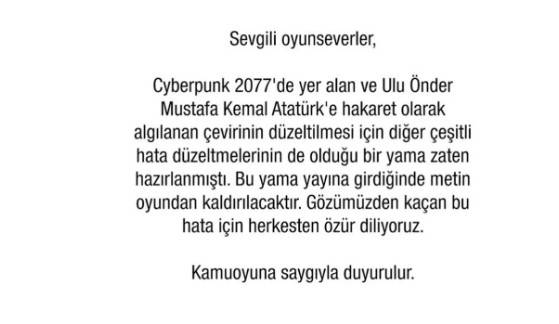 "Sevgili oyunseverler, Cyberpunk 2077'de yer alan ve Ulu Önder Mustafa Kemal Atatürk'e hakaret olarak algılanan çevirinin düzeltilmesi için diğer çeşitli hata düzeltmelerinin de olduğu bir yama zaten hazırlanmıştı. Bu yama yayına girdiğinde metin oyundan kaldırılacaktır. Gözümüzden kaçan bu hata için herkesten özür diliyoruz. Kamuoyuna saygıyla duyurulur."