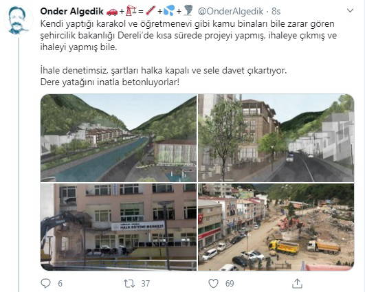 Kendi yaptığı karakol ve öğretmenevi gibi kamu binaları bile zarar gören şehircilik bakanlığı Dereli’de kısa sürede projeyi yapmış, ihaleye çıkmış ve ihaleyi yapmış bile. İhale denetimsiz, şartları halka kapalı ve sele davet çıkartıyor. Dere yatağını inatla betonluyorlar! Toki ihale açıklamasında geleneksel mimari ile yapılacak demiş. Asfalt-beton-peyzajdan oluşan her yerde gördüğümüz geleneksel Toki mimarisi.