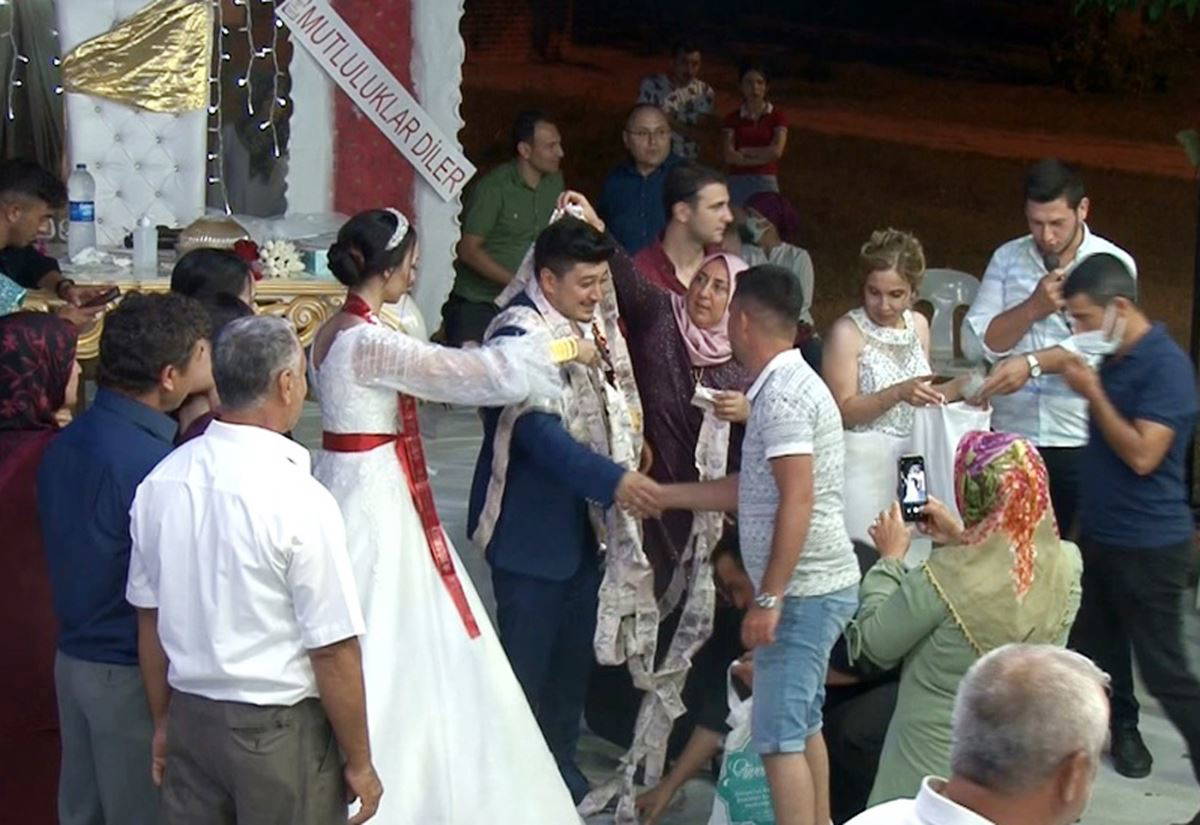 Serik'te evlenen su tesisatçısı Halil İbrahim ve Gizem Tanrıkulu'na (24) arkadaşları, düğünde sürpriz yaptı. Damadın arkadaşları, kendi aralarında topladıkları 5 bin lirayı 5'er liralık banknotlar haline getirdi. 1000 adet 5 liralık banknotu birbirine iğneleyen arkadaşlar, uzunluğu 50 metreyi bulan paraları düğünde damadın boynuna dolayıp, düğün hediyesi yaptı. Takı töreninde anonsu yapan kişinin 'Damadın arkadaşlarından zincirleme, upuzun Antalya'dan Serik'e, Serik'ten Alanya ve Gazipaşa'ya, oradan Mersin'e, Mersin'den Van'a kadar 5'lik. Sar sar sabaha kadar sayarsın artık' anonsu ise güldürdü.