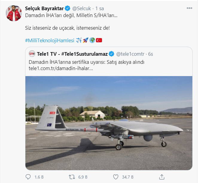 Bayraktar konuyu, "Damadın İHA’larına sertifika uyarısı: Satış askıya alındı" başlığıyla duyuran bir habere yanıt verdi.