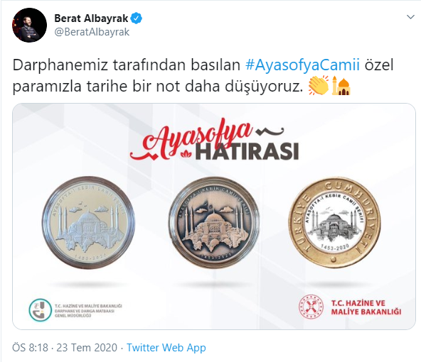 Albayrak paylaşımında "Darphanemiz tarafından basılan 'Ayasofya Camii' özel paramızla tarihe bir not daha düşüyoruz" ifadesini kullandı.