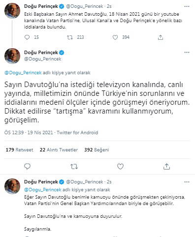 Perinçek, Twitter hesabı üzerinden Davutoğlu’na herhangi bir televizyon programında canlı yayında "görüşme" teklifi yaptı.