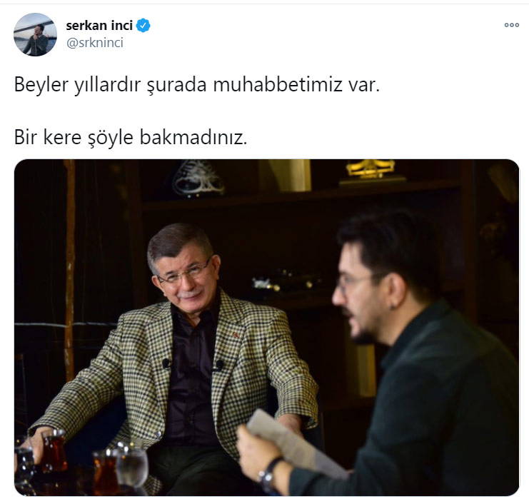 Davutoğlu bir karesine ise İnci şunları yazdı: “Beyler yıllardır şurada muhabbetimiz var. Bir kere şöyle bakmadınız.”