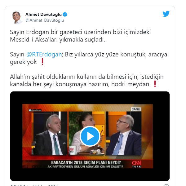 “Sayın Erdoğan bir gazeteci üzerinden bizi içimizdeki Mescid-i Aksa’ları yıkmakla suçladı. Sayın Erdoğan, biz yıllarca yüz yüze konuştuk, aracıya gerek yok. Allah’ın şahit olduklarını kulların da bilmesi için, istediğin kanalda her şeyi konuşmaya hazırım, hodri meydan”