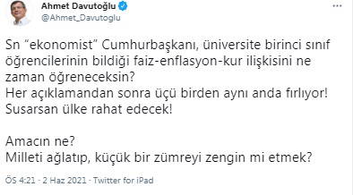 Erdoğan'a Twitter üzerinden "Sn “ekonomist” Cumhurbaşkanı" diye seslenen Davutoğlu, "Üniversite birinci sınıf öğrencilerinin bildiği faiz-enflasyon-kur ilişkisini ne zaman öğreneceksin? Her açıklamandan sonra üçü birden aynı anda fırlıyor! Susarsan ülke rahat edecek!" dedi.