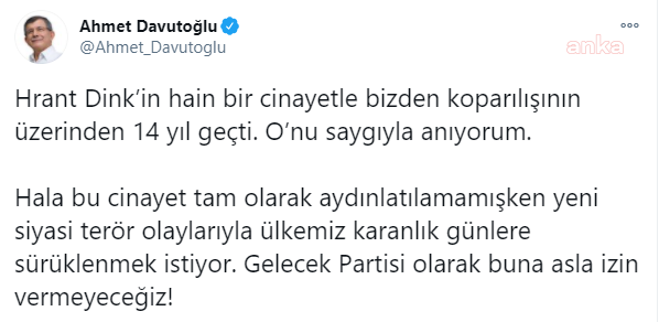 "Hrant Dink’in hain bir cinayetle bizden koparılışının üzerinden 14 yıl geçti. O’nu saygıyla anıyorum. Hala bu cinayet tam olarak aydınlatılamamışken yeni siyasi terör olaylarıyla ülkemiz karanlık günlere sürüklenmek istiyor. Gelecek Partisi olarak buna asla izin vermeyeceğiz!"