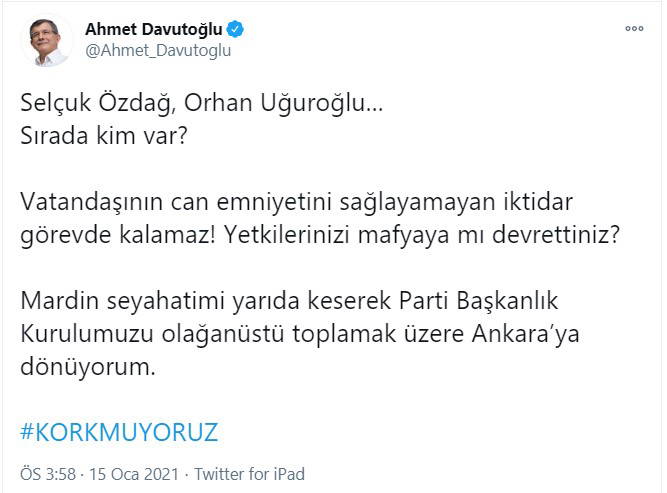 “Selçuk Özdağ, Orhan Uğuroğlu… Sırada kim var? Vatandaşının can emniyetini sağlayamayan iktidar görevde kalamaz! Yetkilerinizi mafyaya mı devrettiniz? Mardin seyahatimi yarıda keserek Parti Başkanlık Kurulumuzu olağanüstü toplamak üzere Ankara’ya dönüyorum. #KORKMUYORUZ”