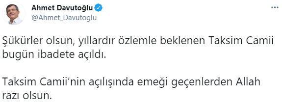 Öte yandan Gelecek Partisi Genel Başkanı Ahmet Davutoğlu da Taksim Camii'nin ibadete açılması üzerine açıklamalarda bulundu. Davutoğlu, Twitter hesabından yaptığı açıklamada, "Şükürler olsun, yıllardır özlemle beklenen Taksim Camii bugün ibadete açıldı. Taksim Camii’nin açılışında emeği geçenlerden Allah razı olsun" ifadelerini kullandı.