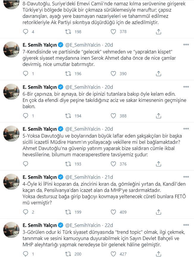 MHP Genel Başkan Yardımcısı Semih Yalçın sosyal medya hesabı Twitter üzerinden yaptığı açıklamada şunları kaydetti: