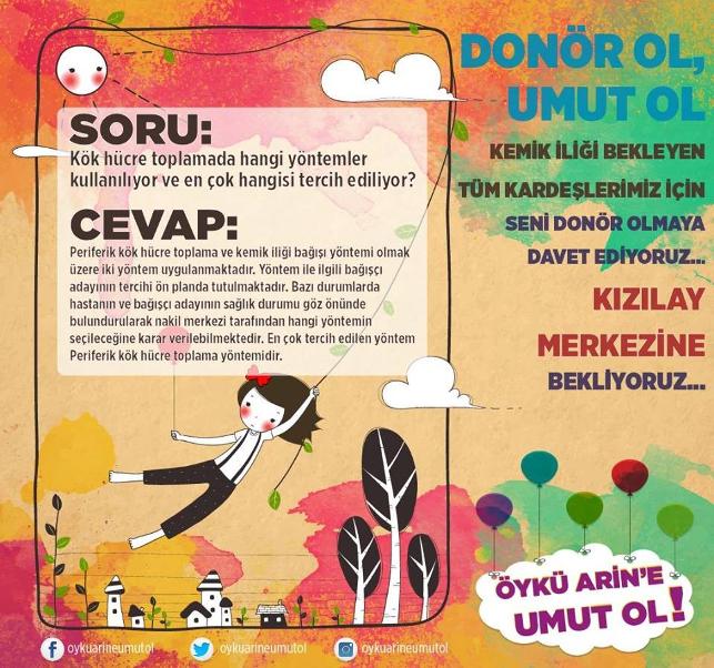 Öykü Arin 3.5 yaşında, lösemi tedavisi için kök hücre bağışı bekleyen onlarca çocuktan biri. Türkiye’de ve dünyada pek çok insanı yan yana getirdi. Başka çocuklar için de umut oldu. Öykü’nün ailesi de kızlarının iyileşeceğine yürekten inanıyor. Umut, onları ayakta tutuyor. Şimdi sıra bizde. Öykü’yü yaşatmak elimizde. Öykü’nün fotoğraflarına bakıp ah vah demek, sosyal medyada kampanya videolarını paylaşmak, beğenmek yetmez. Yapmamız gereken kök hücre bağışı için harekete geçmek. İşlem çok basit ve kısa. En yakın Kızılay’ın kan alma merkezine gidip form dolduruyorsunuz. İki dakika bile sürmeden bir tüp kan veriyorsunuz. Hepsi bu...