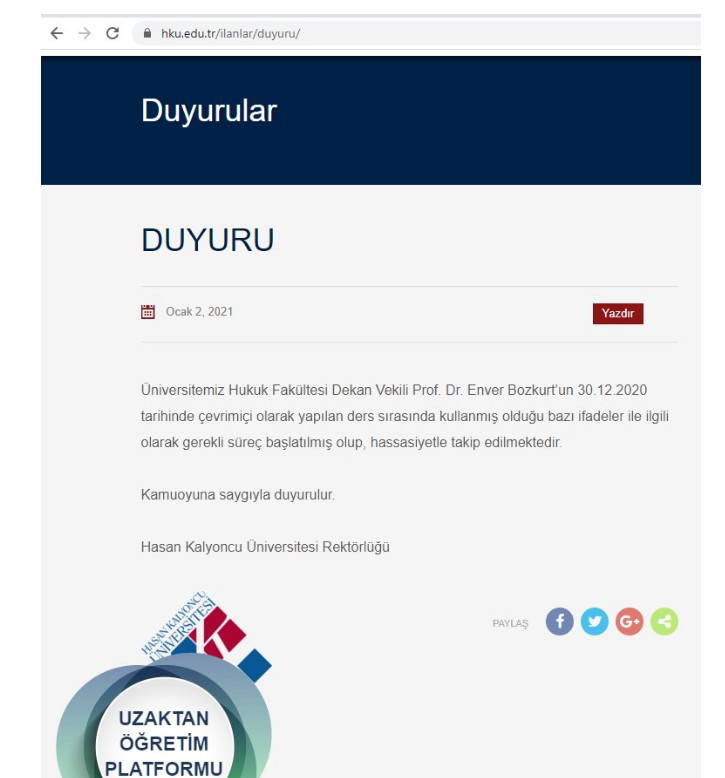 Üniversite rektörlüğü tarafından yapılan açıklamada: "Üniversitemiz Hukuk Fakültesi Dekan Vekili Prof. Dr. Enver Bozkurt’un 30.12.2020 tarihinde çevrimiçi olarak yapılan ders sırasında kullanmış olduğu bazı ifadeler ile ilgili olarak gerekli süreç başlatılmış olup, hassasiyetle takip edilmektedir." ifadeleri yer aldı.