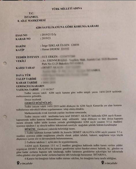 Ece Erken programında yaptığı bu açıklamaların ve Demet Akalın hakkında yaptığı sert çıkışların sonrasında şimdi de mahkeme kararı çıkartarak Demet Akalın hakkında bir aylık tedbir kararı aldırdı. Akalın’ın kendisine hakaret ettiğini öne süren Erken hesabından mahkeme kararını ve şu sözleri paylaştı: