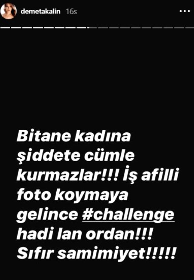 Popçu Demet Akalın ise Instagram hesabının hikaye kısmından "Bir tane kadına şiddete cümle kurmazlar! İş afili fotoğraf koymaya gelince #challenge. Hadi lan oradan! Sıfır samimiyet" ifadelerini kullandı.
