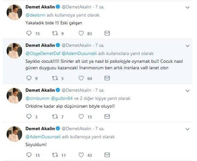 Demet Akalın, gece saatlerinde Twitter hesabından “Bela mı okuyum bu saatlere kadar beni böyle uykusuz bıraktığın için. İnşallah en ağır cezayı alırsın” yazdı. Takipçileri, Akalın'a ne olduğunu sorunca ünlü şarkıcı şunları yazdı: