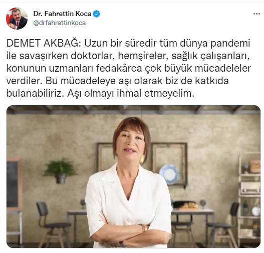 Tiyatro oyuncusu Demet Akbağ ve şarkıcı Sertap Erener, Sağlık Bakanlığı'nın hazırladığı kamu spotu için kamera karşısına geçti. Sağlık Bakanı Fahrettin Koca'nın paylaştığı kamu spotunda iki sanatçı, yurttaşları aşı olmaları için uyardı.
