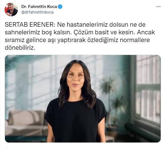 Erener de, yurttaşları aşı olmaya davet ederek, "Ne hastanelerimiz dolsun ne de sahnelerimiz boş kalsın. Çözüm basit ve kesin. Ancak sıramız gelince aşı yaptırarak özlediğimiz normallere dönebiliriz" ifadelerini kaydetti.