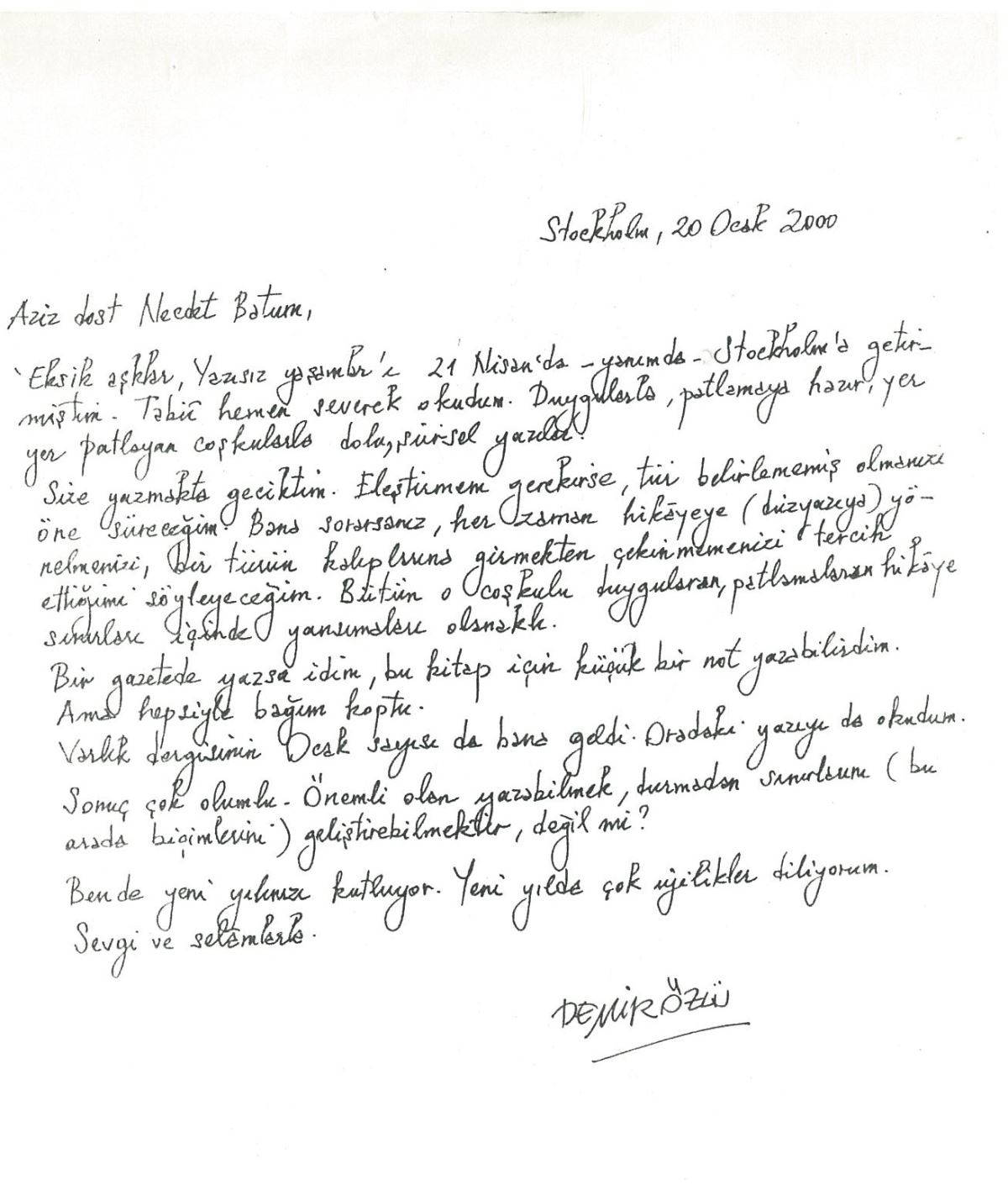 “‘Bir Sokağı Aramak’ için söylediğiniz ‘imge ve düşün dehlizleri’ metaforu beni çok memnun etti. Gerçekten heyecanla öyle dehlizlerde dolaşmaya çalıştım. Prag’a giderek Kafka’nın izini sürmüştüm. 90’lı yılların başlarında. Aranan yazar hep O’dur. Çalışmalarınızda başarılar. Selam ve sevgiler.