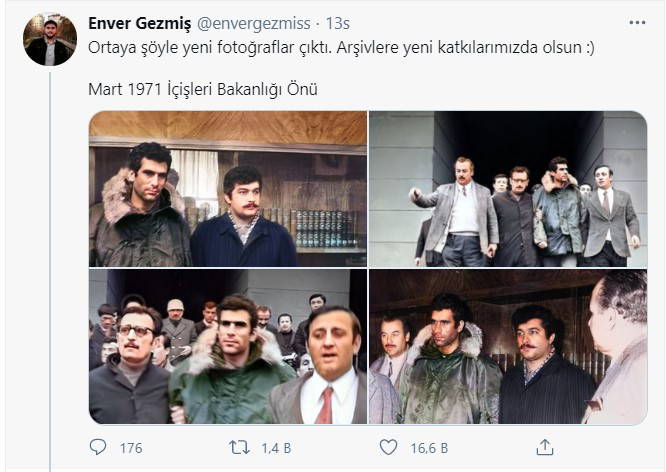 Enver Gezmiş tarafından Twitter'dan paylaşılan fotoğraflara, "Ortaya şöyle yeni fotoğraflar çıktı. Arşivlere yeni katkılarımızda olsun :) Mart 1971 İçişleri Bakanlığı Önü" notu düşüldü.