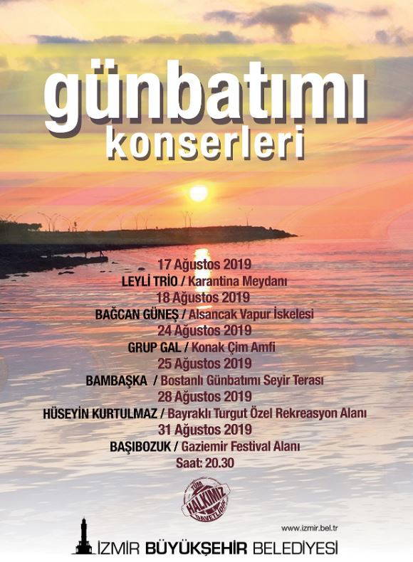 İzmirliler tarafından çok beğenilen Günbatımı Konserleri kapsamında Leyli Trio 17 Ağustos Cumartesi Karantina Meydanı’nda, Bağcan Güneş 18 Ağustos Pazar Alsancak Vapur İskelesi’nde, Grup Gal 24 Ağustos Cumartesi Konak Çim Amfi’de, Bambaşka 25 Ağustos Pazar Bostanlı Günbatımı Seyir Terası’nda, Hüseyin Kurtulmaz 28 Ağustos Çarşamba Bayraklı Turgut Özel Rekreasyon Alanı’nda ve Başıbozuk 31 Ağustos Cumartesi Gaziemir Festival Alanı’nda İzmirlilerle buluşacak.