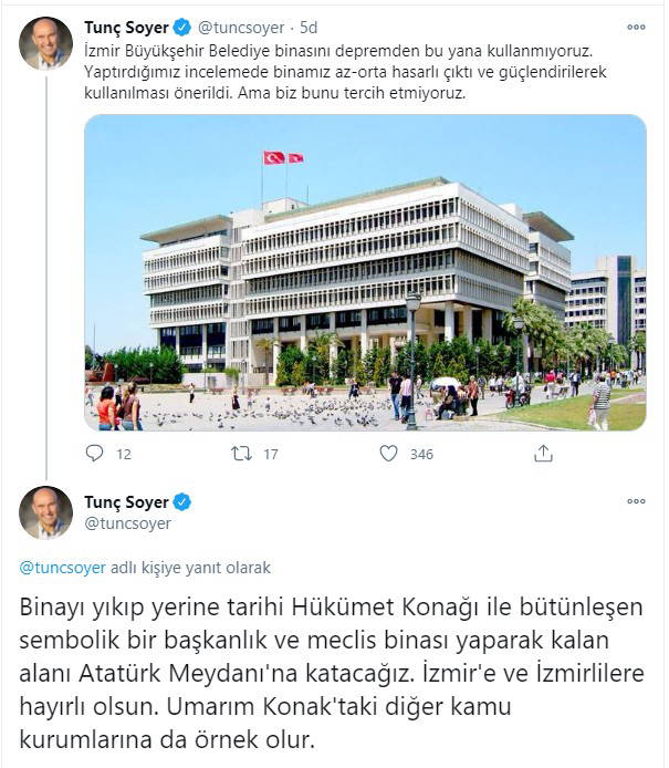 "Binayı yıkıp yerine tarihi Hükümet Konağı ile bütünleşen sembolik bir başkanlık ve meclis binası yaparak kalan alanı Atatürk Meydanı'na katacağız" diyen Soyer, "İzmir'e ve İzmirlilere hayırlı olsun. Umarım Konak'taki diğer kamu kurumlarına da örnek olur" açıklamasında bulundu.
