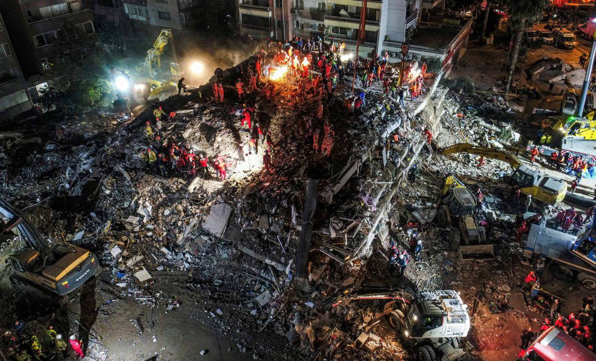 İzmir depreminde yıkılan Rızabey apartmanında gece devam eden arama kurtarma çalışmaları. / İHA